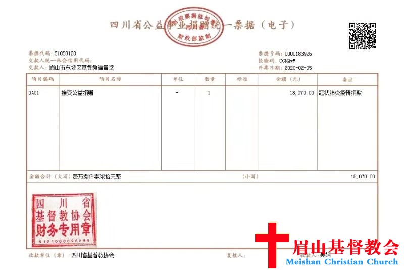 教会通过网络会议召集爱国会、执事同工研究抗疫工作,将募集的所有善款汇集到四川省基督教协会。由省基督教两会统一采购、支配用于抗击疫情。 省基督教两会也及时的将正规发票返回给我们。